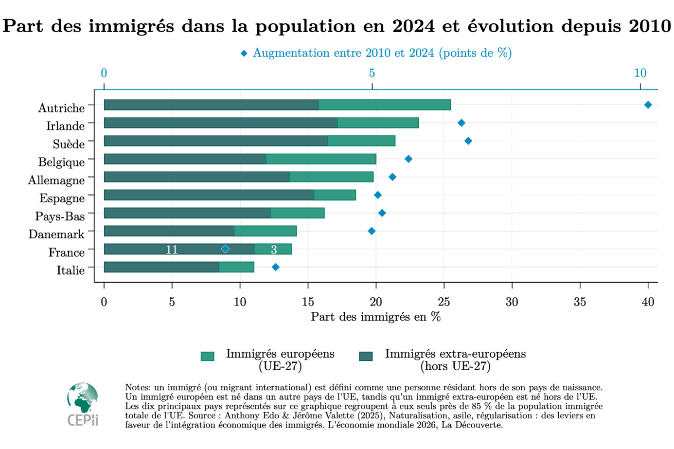 LE Graphique – THE ChartEn 2024, la part des immigrés dans la population française s’élève à près de 14 %, un niveau inférieur à celui observé dans les autres principaux pays d’accueil de l’Union européenne. Lire la suite sur notre blog