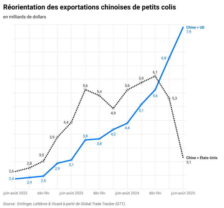 Parmi eux, les petits colis se distinguent particulièrement. Bénéficiant d’un régime douanier simplifié dans l’UE toujours en vigueur alors qu’il a été supprimé en avril 2025 aux États-Unis, leur valeur exportée depuis la Chine a bondi de 80 % sur un an, tandis que celle vers les États-Unis était divisée par deux.