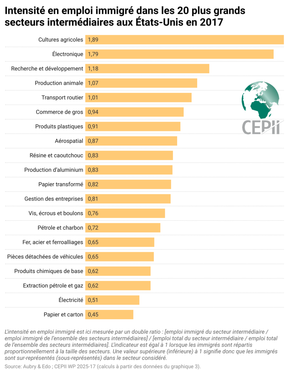 Une étude du CEPII, portant sur les États-Unis sur la période 2003-2017, montre qu’un autre canal opère sur la performance des secteurs exportateurs : une augmentation de l'emploi immigré dans les industries en amont entraîne une hausse des exportations en aval. Un effet qui provient en partie de l’amélioration de l'efficacité productive qui réduit le coût des intrants en amont. En se focalisant sur les 20 secteurs intermédiaires les plus importants aux États-Unis en 2017, classés par valeur des ventes, on observe que les immigrés sont particulièrement représentés dans les cultures agricoles (blé, maïs), l’électronique (composants, circuits imprimés), et la R&D (laboratoires, conception de produits). Les secteurs exportateurs qui dépendent de ces industries bénéficient ainsi de la présence des immigrés qui y sont employés et des gains de productivité qui y sont associés.