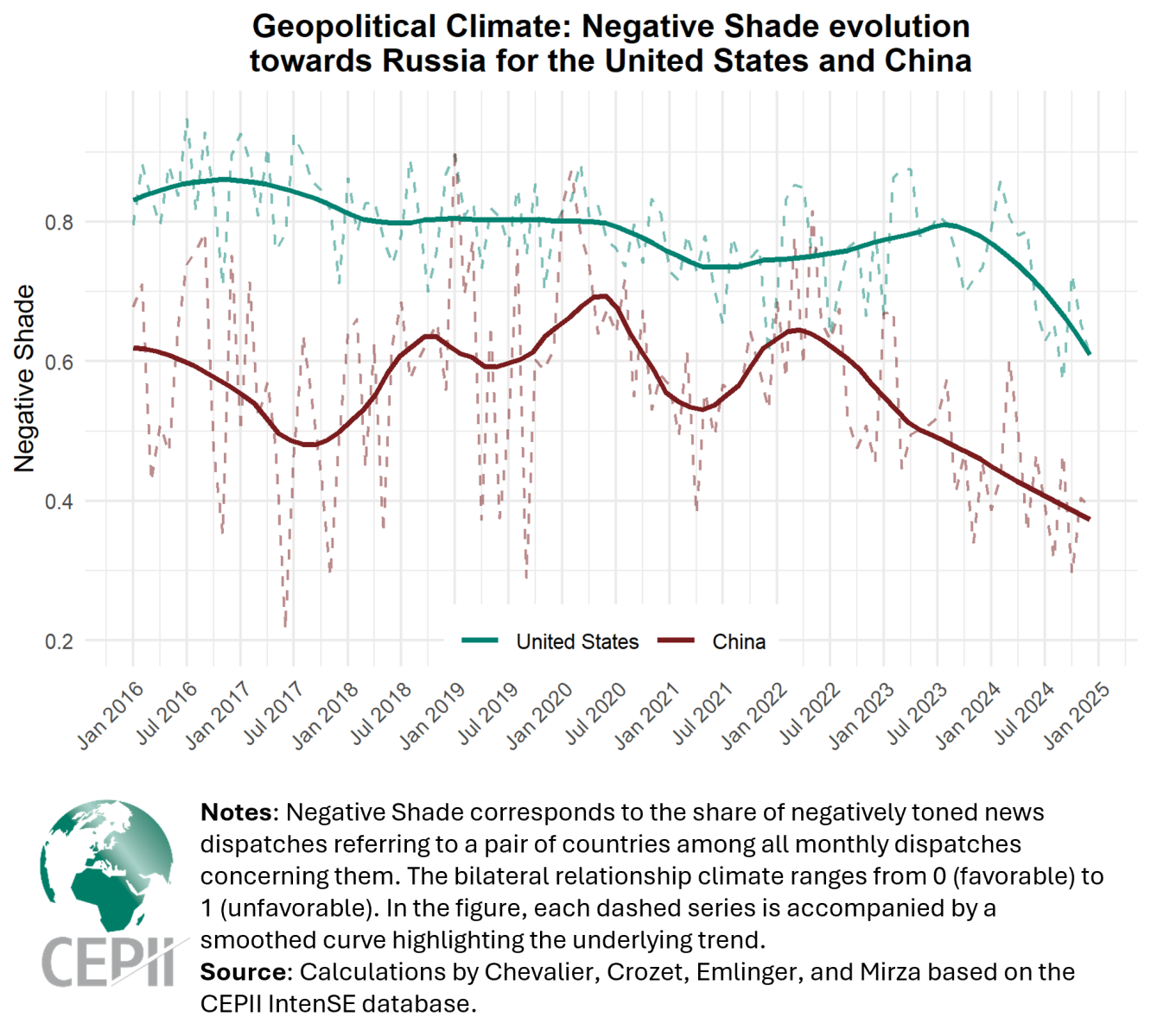 The new IntenSE (Intensity and Shade of Events) database developed by CEPII draws on news agency dispatches from the GDELT database to construct the “Shade” indicator, which captures the negative tone of the geopolitical climate at the level of bilateral relations among 201 countries since 2016, on a monthly basis.