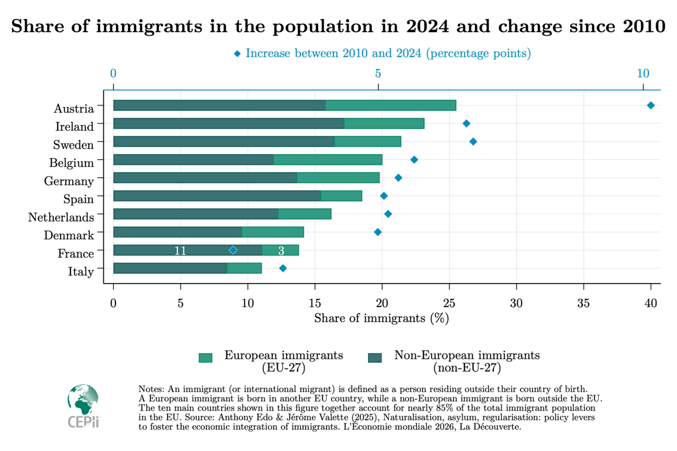 In 2024, immigrants account for nearly 14% of the French population, a level lower than that observed in the other main host countries of the European Union. Read more on the blog